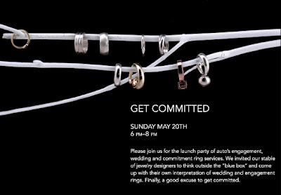 “Please join us for the launch party of auto’s engagement, wedding and commitment ring services. We invited our stable of jewelry designers to think outside the “blue box” and come up with their own interpretation of wedding and engagement rings. Finally, a good excuse to get committed.”